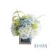 绣球+白玫瑰:天蓝色绣球,雪山白玫瑰,绿色康乃馨,黄剑叶,玻璃花瓶插花。