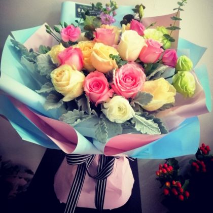 香槟玫瑰苏醒玫瑰混搭19枝,洋桔梗搭配。