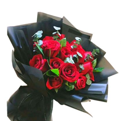 花材:19枝优选级昆明红玫瑰,尤加利 绿叶搭配。 包装:黑色雾面纸圆形包装,黑色蝴蝶结束扎。