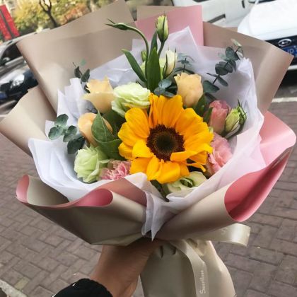 1枝向日葵,3枝香槟玫瑰,3枝粉色康乃馨,青色洋桔梗,尤加利
