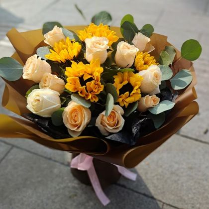 5枝向日葵,11枝香槟玫瑰,苹果叶尤加利