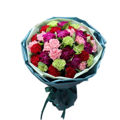 红色康乃馨10枝,粉色康乃馨10枝,紫色康乃馨8枝,绿色康乃馨7枝,绿叶搭配