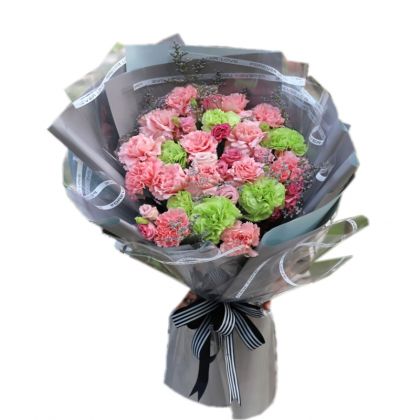 花材:12枝粉色康乃馨,6枝绿色康乃馨,粉色洋桔梗,情人草搭配。 包装:透明线条玻璃纸内衬,中灰欧雅纸精美包装,黑白横条纹盘带蝴蝶结装饰。