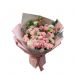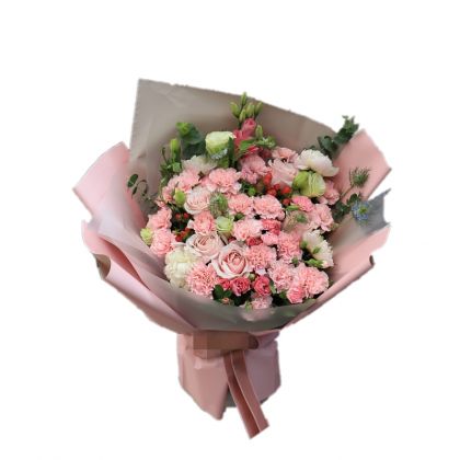 花材:18枝粉色康乃馨,6枝粉玫瑰,2枝多头粉玫瑰,3枝刺琴,白色洋桔梗,红豆,尤加利搭配。 包装:半透明雾面纸内衬,粉色欧雅纸精美包装,无纺布蝴蝶结装饰。