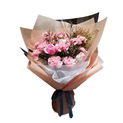 9枝粉色康乃馨,3枝粉玫瑰,1枝多头粉玫瑰,澳梅,黄英搭配