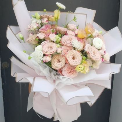 花材:淡紫色玫瑰9枝,荔枝粉玫瑰3枝,洋桔梗,翠珠搭配。 包装:雪梨纸,金边雾面纸精美包装。