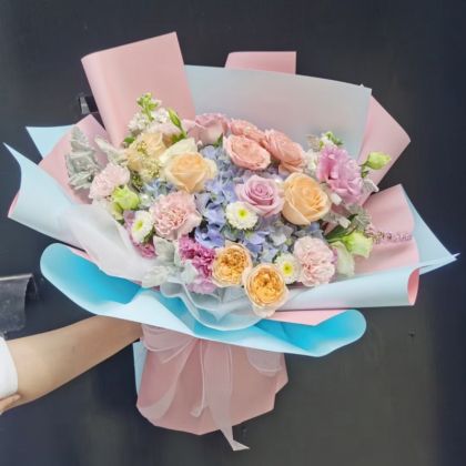 荔枝粉玫瑰3枝,粉玫瑰2枝,荔枝香槟玫瑰2枝,香槟玫瑰3枝,粉色康乃馨5枝,绣球1枝,银叶菊,白色小