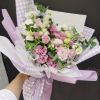 粉玫瑰6枝,粉色、白色洋桔梗,尤加利,银叶菊,白色小菊等搭配。