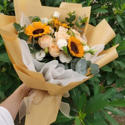 香槟玫瑰6枝,向日葵3枝,白色洋桔梗,尤加利搭配。