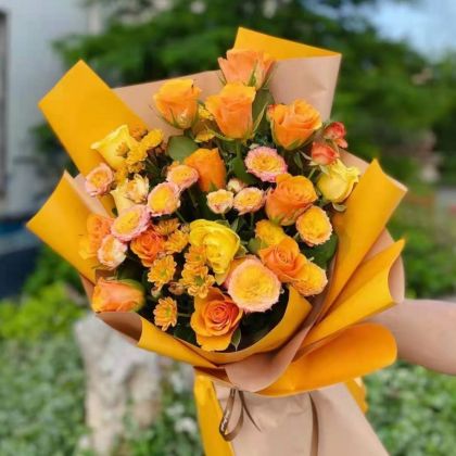 橘色玫瑰10枝,黄色玫瑰5枝,多头玫瑰1枝,黄色小菊搭配。