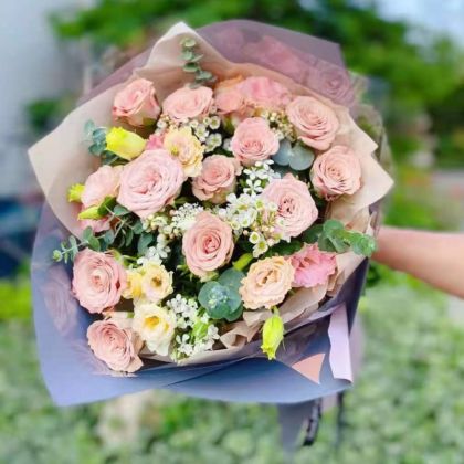 花材:粉玫瑰12枝,洋桔梗,石竹梅,尤加利等搭配。 包装:紫色欧雅纸精美包装。