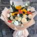 花材:香槟玫瑰9枝,粉玫瑰2枝,向日葵3枝,多头玫瑰3枝,白色洋桔梗,尤加利搭配。 包装:肉色雾面纸精美包装,白色丝带装饰。