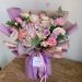 花材:紫玫瑰9枝,粉玫瑰6枝,白玫瑰6枝,粉色绣球2枝,尤加利搭配。 包装:网纱,紫色欧雅纸精美包装,紫色粉色丝带装饰。