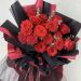 花材:红玫瑰16枝,尤加利搭配。 包装:黑色网纱,红黑双色欧雅纸精美包装,红色丝带装饰。