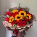 花材:红玫瑰18枝,向日葵5枝,尤加利搭配。 包装:雪梨纸,肉粉色卡纸精美包装,红色丝带装饰。