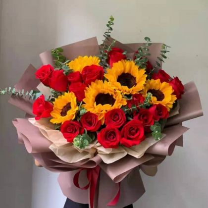 红玫瑰18枝,向日葵5枝,尤加利搭配。