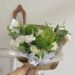 花材:白玫瑰3枝,绿石竹2枝,绿掌1枝,白色洋桔梗,绿叶搭配。 包装:白色雪梨纸,咖啡色卡纸精美包装,白色缎带装饰。