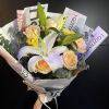 白色三头百合1枝,香槟玫瑰5枝,多头玫瑰2枝,尤加利搭配。