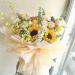 香槟玫瑰6枝,白玫瑰3枝,向日葵3枝,黄色乒乓菊2枝,多头玫瑰2枝,洋甘菊,洋桔梗,跳舞兰,小菊,尤