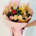 花材:红玫瑰1枝,粉玫瑰3枝,香槟玫瑰2枝,向日葵1枝,白色洋桔梗,小菊,鼠爪搭配。 包装:粉金双面欧雅纸精美包装,酒红色缎带装饰。
