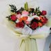 花材:三头白百合1枝,粉玫瑰5枝,红玫瑰10枝,多头玫瑰2枝,小菊,石竹梅,天竺葵绿叶装饰。 包装:白色雪梨纸,镶边透明淡姜黄雾面纸精美包装。