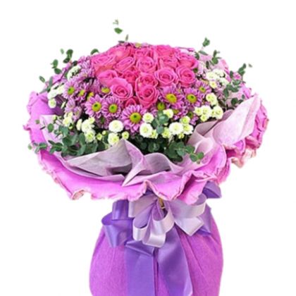 [材料]:18枝粉佳人玫瑰,白色和玫红色小菊花围绕,尤加利搭配 [包装]:淡粉色棉纸内衬,玫红色卷
