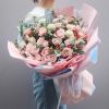 33枝粉玫瑰,3枝乒乓菊,红豆、银叶菊、尤加利搭配。
