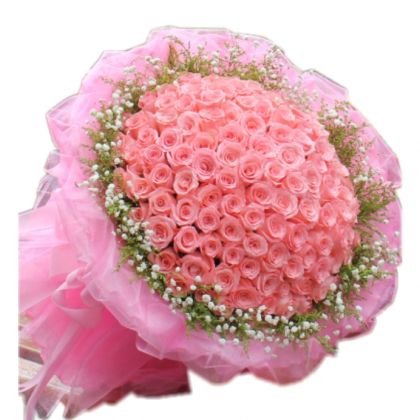 [材料]:99枝戴安娜玫瑰,黄英,满天星围绕。 [包装]:粉色棉纸内衬,粉色软纱外围精美包装,粉色