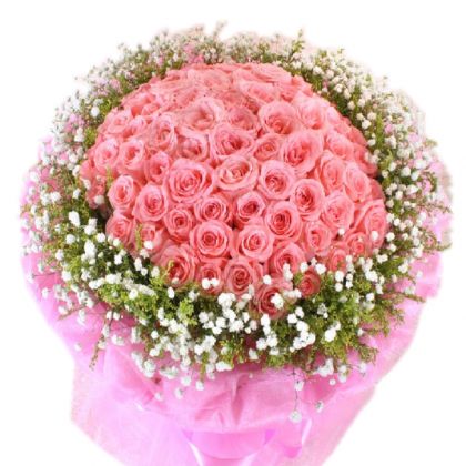 [材料]:99枝戴安娜粉玫瑰,黄英搭配,满天星围绕。 [包装]:粉色卷边纸内衬,粉纱外围圆形精美包