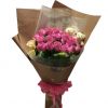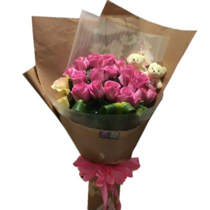 [材料]:19枝苏醒玫瑰,洋桔梗、巴西叶搭配,送卡通2只。 [包装]:白色雾面纸和褐色卡纸扇形精美