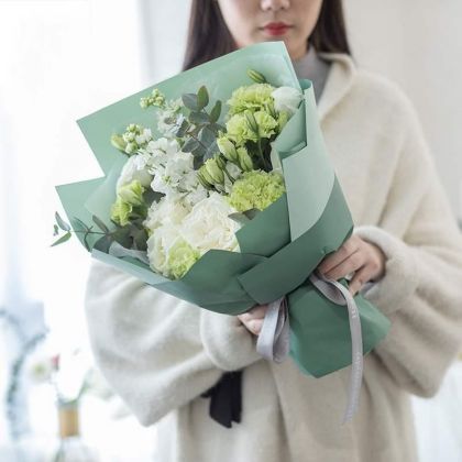6枝绿色康乃馨,6枝白玫瑰,2枝白色紫罗兰,青色洋桔梗、尤加利搭配。