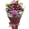[材料]:21枝苏醒玫瑰,绣球花1枝,洋桔梗,石竹梅丰满。 [包装]:白色卡纸,粉色麻片单面精致包
