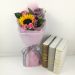 【花材】:向日葵1枝,粉色多头康乃馨2枝,紫色勿忘我,水晶草,绿叶搭配。