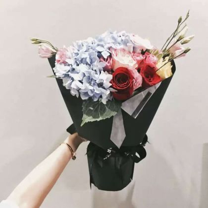 【花材】:蓝色绣球1枝,红玫瑰2枝,粉玫瑰3枝,粉色洋桔梗2枝。