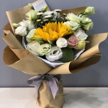 向日葵1枝,白色洋桔梗4枝,白色小菊。