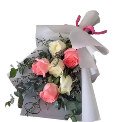 [材料]:3枝戴安娜,3枝白玫瑰,尤加利叶,情人草。 [包装]:淡灰色雾面纸精美包装,粉色丝带束扎