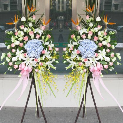 开业花篮-粉玫瑰蓝绣球白百合白色洋桔梗跳舞兰鹤望兰 1只