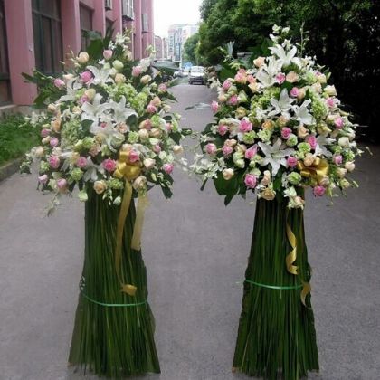 【花材】:白百合,粉玫瑰,香槟玫瑰,绿绣球,绿色康乃馨,绿叶。 【包装】:水蜡叶包柱捆扎。 【备注】:预定花篮请提前1-2天较好。 【计量】:花篮为单个的价格,订购多个请选择数量。
