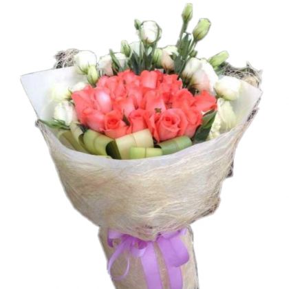 [材料]:29枝粉玫瑰,洋桔梗,黄剑叶搭配。 [包装]:白色无纺布,白色麻纱圆形包装,淡紫色纸带束