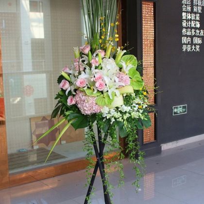 【花材】:粉玫瑰,白百合,绿掌,粉、白绣球,白兰,绿叶。 【包装】:三脚架包装。 【备注】:预定花篮请提前1-2天较好。 【计量】:花篮为单个的价格,订购多个请选择数量。