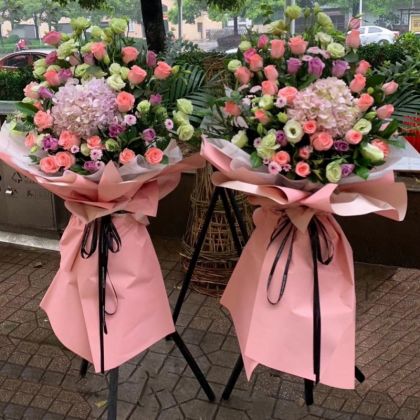 开业花篮-粉绣球粉玫瑰青色桔梗紫玫瑰粉雏菊绿叶 1只