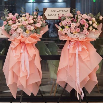 【花材】:粉玫瑰,洋桔梗,尤加利。 【包装】:三脚架+淡橘色包装纸精美包装。 【备注】:预定花篮请提前1-2天较好。 【计量】:1只