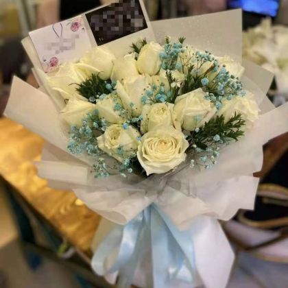 爆款-19枝白玫瑰蓝色满天星送女友老婆情人节七夕节周年纪念