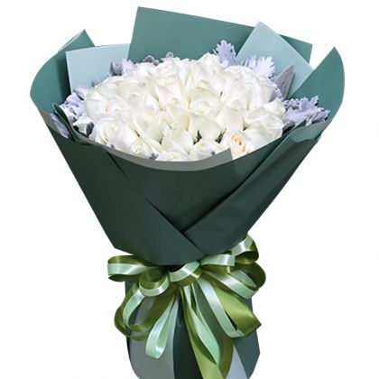 [材料]:33枝白玫瑰,银叶菊搭配。 [包装]:灰色雾面纸圆形包装,黑色细丝带束扎。