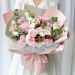 【花材】:粉雪山玫瑰19枝,白色洋桔梗,尤加利,红豆,银叶菊搭配。 【包装】:软纱,粉色欧雅纸包装,粉色丝带装饰。