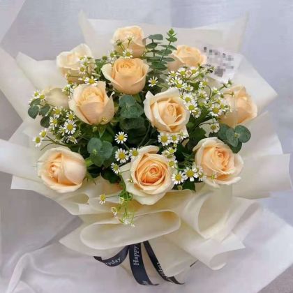 【花材】:香槟玫瑰11枝,洋甘菊,尤加利搭配。 【包装】:白色欧雅纸包装,黑色丝带装饰。
