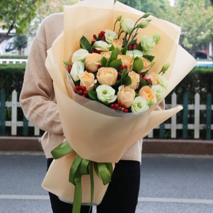 香槟玫瑰11枝,青色洋桔梗,红豆,绿叶搭配。