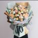 【花材】:香槟玫瑰27枝,白色洋桔梗,尤加利搭配。 【包装】:白色雪梨纸内衬,金绿双色欧雅纸包装,黑色丝带装饰,赠送铜丝灯。