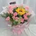 向日葵1枝,粉玫瑰9枝,粉色康乃馨9枝,洋甘菊,尤加利搭配。
