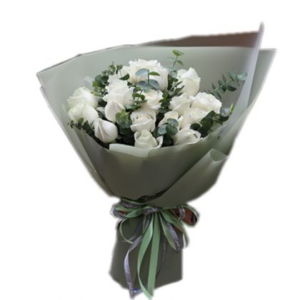 [材料]: 19枝白玫瑰,尤加利搭配。 [包装]:灰色雾面纸圆形精美包装。